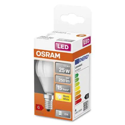 Cette ampoule Osram LED Star Classic E14 Boule Dépolie 3.3W 250lm - 827 | Remplacement 25W avec son efficacité lumineuse de lumen par watt vous permettra de profiter d’un éclairage de qualité. Avec sa durée de vie de 15000 heures, vous n’aurez pas à vous soucier de son remplacement avant quelques années.