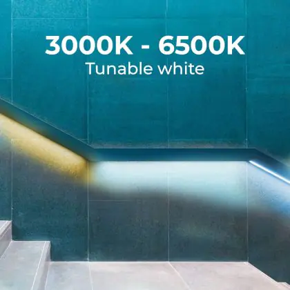Les rubans LED sont la solution idéale si vous désirez un éclairage dans un endroit restreint. Utilisés à des fins décoratives, les rubans LED permettent un éclairage d’ambiance. Ce ruban LED vous propose un éclairage de couleur 3000K - 6500K Tunable White et un flux lumineux de 430 Lm. Il est très simple d’installation et mesure 5000 mm. De plus avec la technologie LED, le ruban LED permet une consommation très faible en énergie et d’avoir une durée de vie pouvant aller jusqu’à 50000 heures.